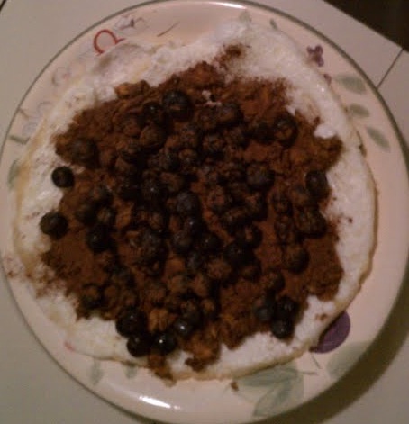 7:30PM - For this one I beat 2 cups of liquid egg whites into a meringue with a pinch of cream or tartar. I then it into a lightly coconut-oiled frying pan and baked at 350* for 15 minutes or so. Once the "pancake" deflated, I flipped it onto a plate and topped it with fresh blueberries and 2 steamed sweet potatoes mashed with cocoa powder and cinnamon. Delicious.